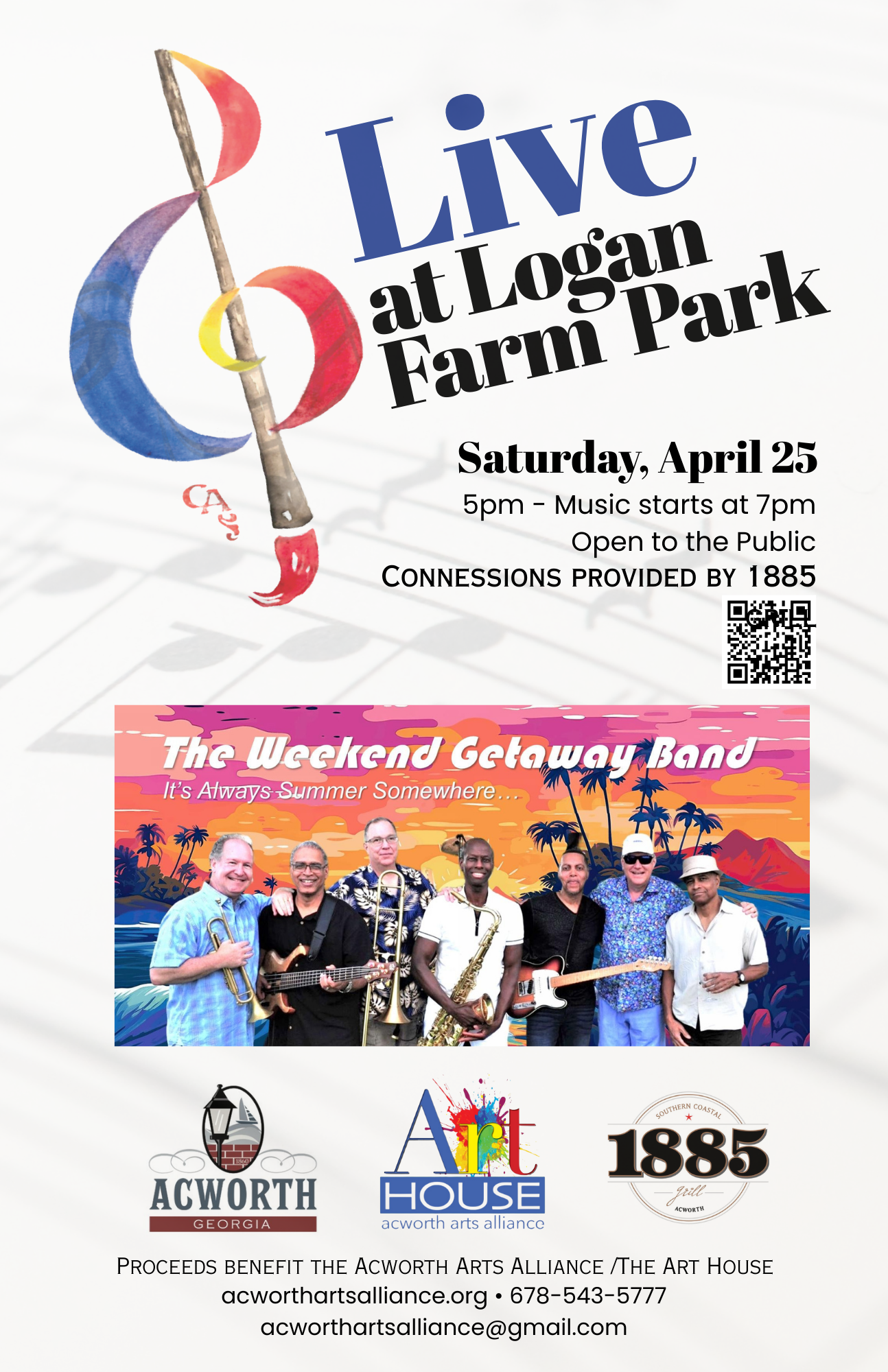 The Acworth Arts Alliance partners with the City of Acworth and 1885 Grill to bring you Live at Logan Farm Park featuring a free concert by Ollie Patterson and the “Weekend Getaway Band”. The music is always amazing!